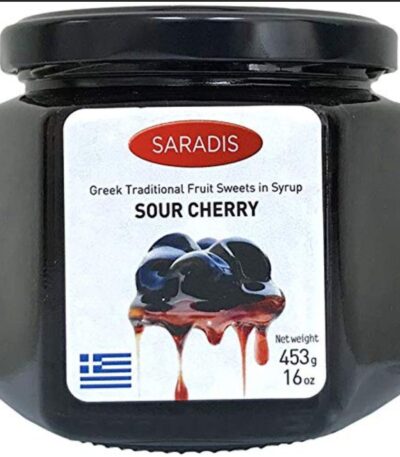 Saradis Sour Cherry Preserve (or Sweet) is a traditional Greek delicacy from Chios, featuring whole sour cherries in a rich, tart syrup, often called a “spoon sweet” (glyko tou koutaliou). Made with sour cherries, sugar, and corn syrup, it’s enjoyed as a dessert with coffee, spooned over yogurt/ice cream, or used in baking for a burst of tangy flavor, with the brand emphasizing its artisanal quality and authentic Greek taste