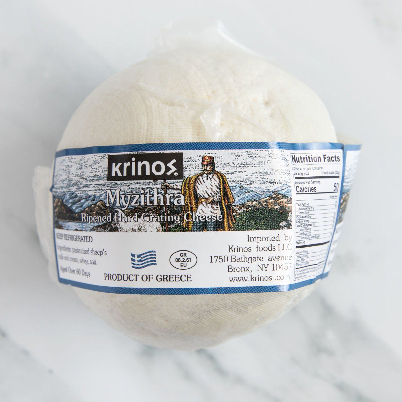 Our version of Myzithra is the pressed and dried version. It is similar to Italian Ricotta Salata and is a popular grating cheese in Greece. The cheese is quite crumbly and salty, so a little bit can add a lot of flavor to your dishes.